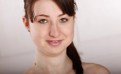 Hot teen Becca in jeans exhibits her butt and bald pussy