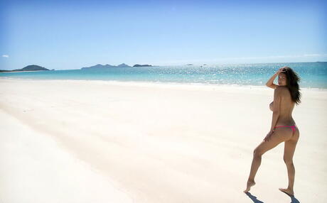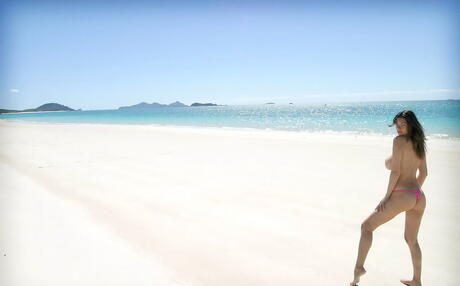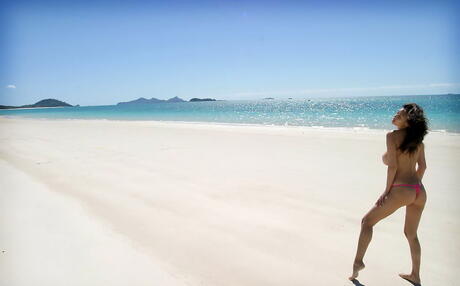Inviting american dark-haired porn star Tera Patrick shows big knockers and hot ass at beach