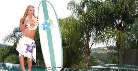 Inviting american milf Mia Lelani exposing big hooters and hot ass near the pool