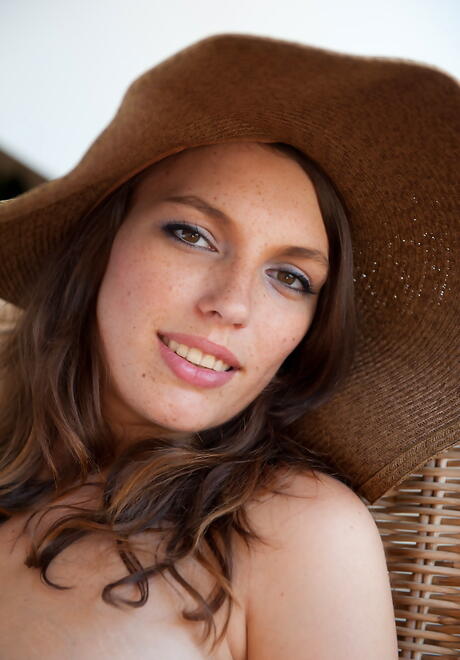 Inviting dark hair hottie Domenica in sexy skirt exhibits big tits and bald pussy