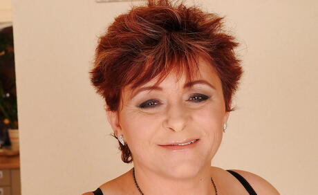 Inviting grandma Hetera in sexy underwear reveals big boobs and shaved pussy