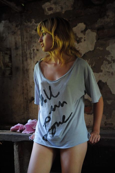 Blonde teen Angie N gets naked in a pair of socks before masturbating