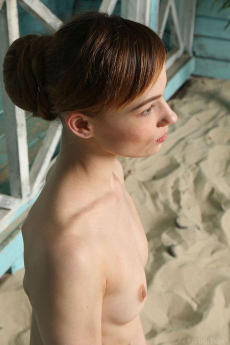 Blonde teen Liania strips down on a sandy beach