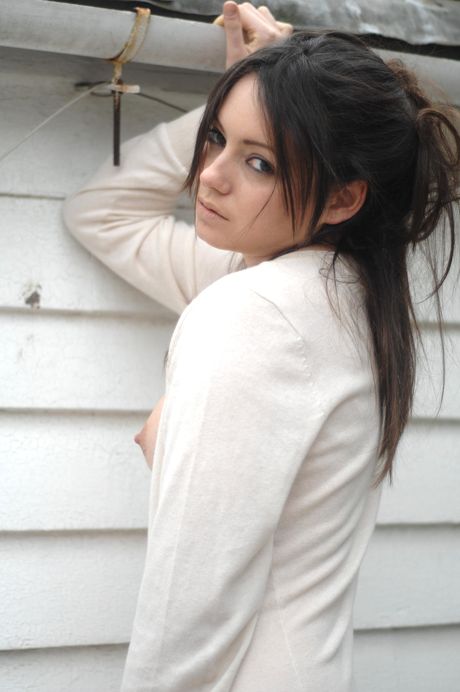 Brunette chick Brionie W gets naked in socks on a sandy beach