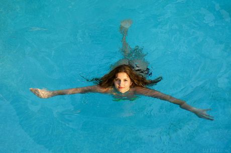 Charming teen Zoeya removes a neon bikini to pose nude in a swimming pool