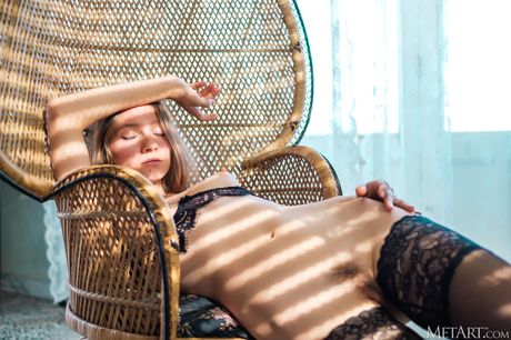Engaging teen Isla removes her black stockings to get totally naked on a balcony