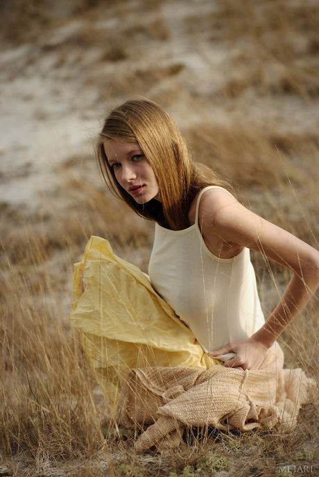 Lean teen Valentine A gets naked on a sandy beach in a playful manner
