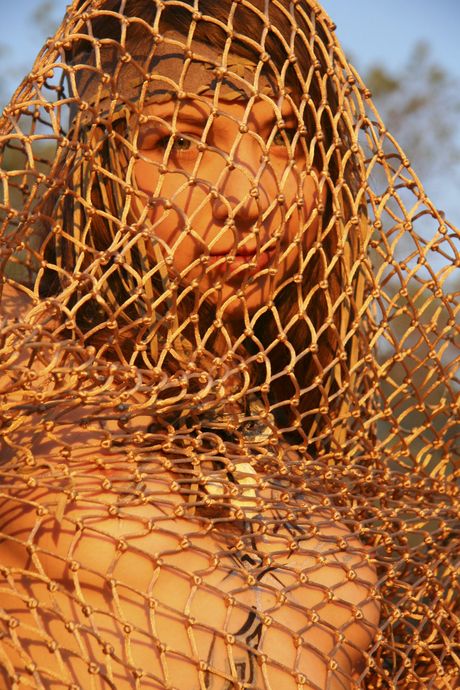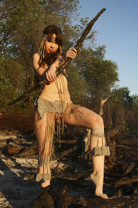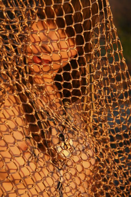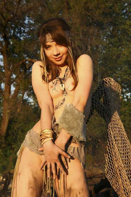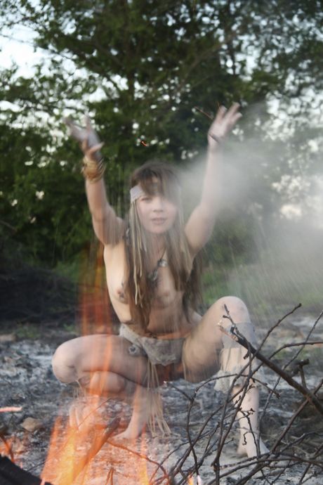 Lovely teen Laska A poses nude in a mesh top and heels in a forest
