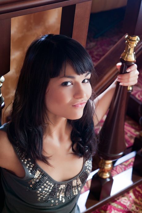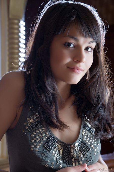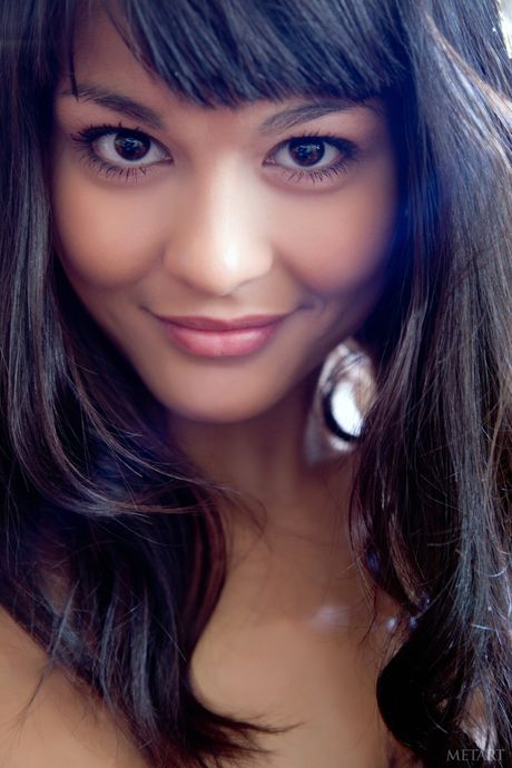 Petite teen Shereen A highlights her landing strip pussy while naked on a bed