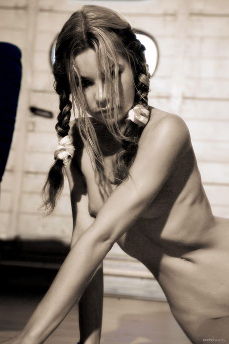 Slender teen Kristzy shows her tiny tits and hairy pussy in the nude