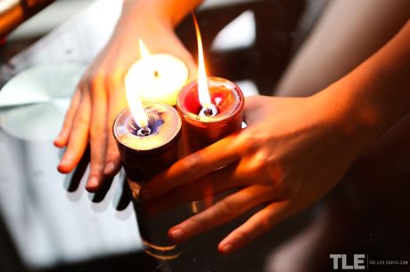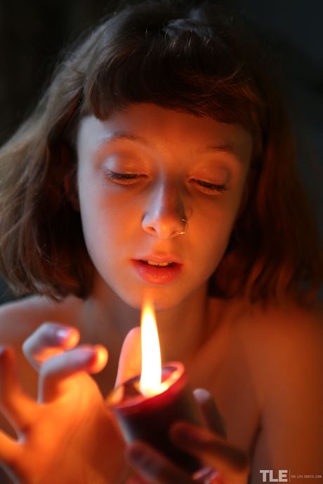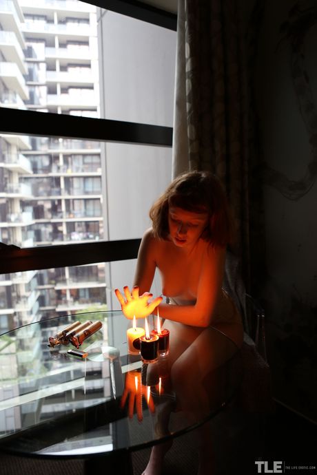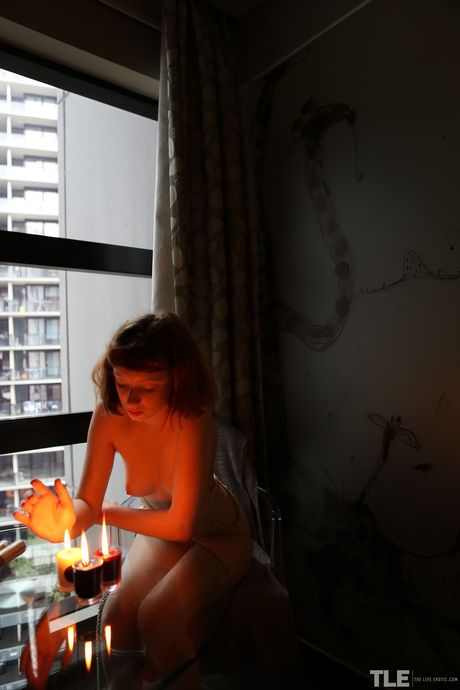 Tall blonde Sondrine removes her lingerie to finger her trimmed pussy
