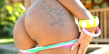 Lovely american milf Candice Nicole in fancy shorts exposing big titties and butt near the pool