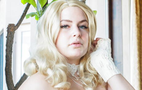 Lovely blond babe Danielle Delaunay in nice skirt showing big hooters and playing with dildo
