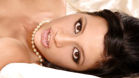 Lovely dark-haired cutie Krisztina Banx in stockings bares big boobs and puts a toy in her pussy