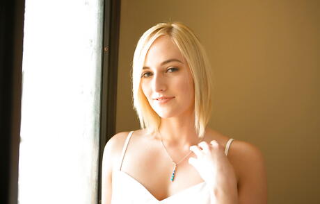 Luscious american blond youthful Kate England in sexy skirt denudes tiny tits and spreads her legs