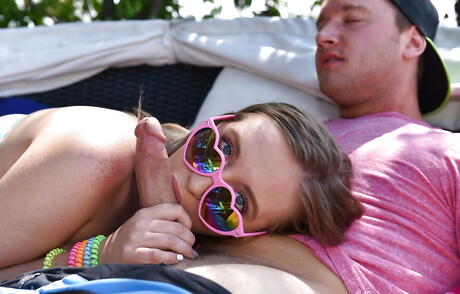 Luscious american teen Harley Jade in fancy shorts sucking hot big cock and takes a facial outdoor