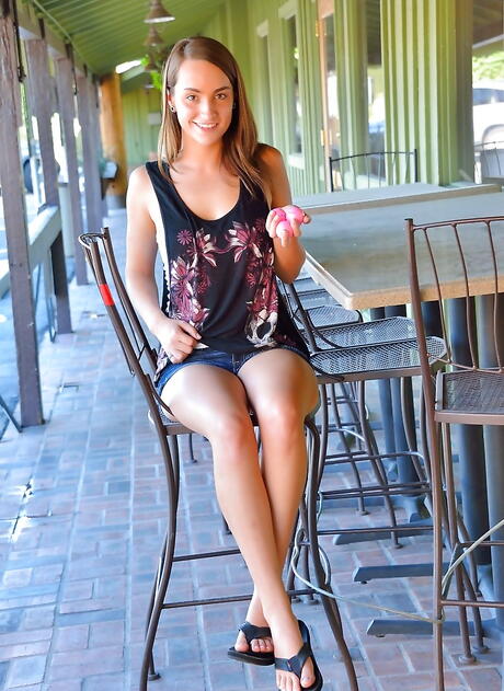Luscious american teen Jeri Lynn showing big knockers and playing with sex toy outdoor
