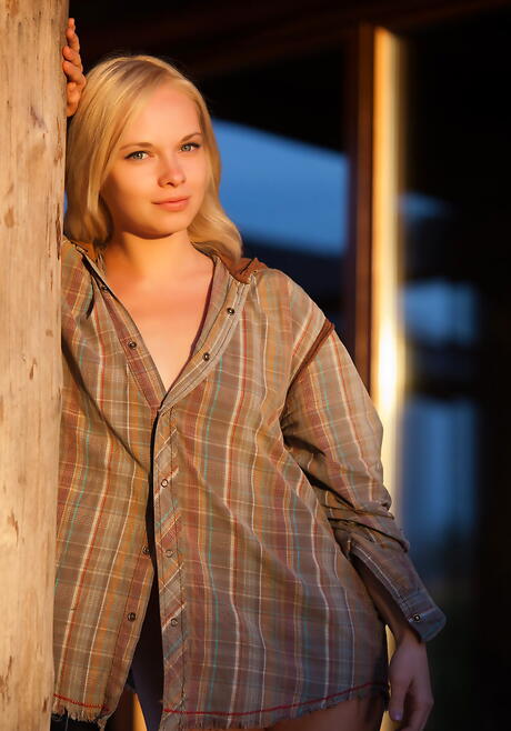 Luscious blond youthful Feeona A baring small tits and hairy pussy outdoor