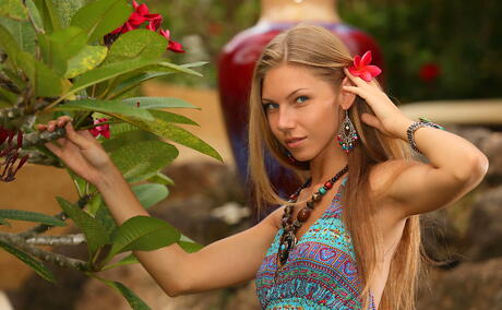 Luscious blonde teen Anjelica in fancy skirt showing her ass and bald pussy near the pool