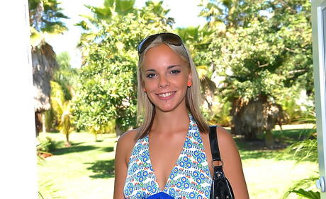 Luscious blonde teen Holly in fancy shorts baring big tits and hot ass