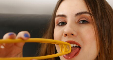 Luscious brunette babe Elle Rose unveiling small tits and masturbating with sex toy