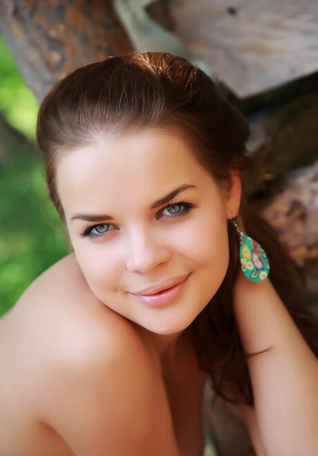 Luscious brunette teen Linda in skirt baring tiny tits and shaved pussy outside