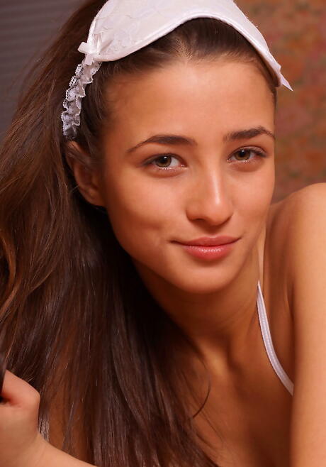 Luscious dark hair teen Sasha P exhibiting small tits and bald pussy