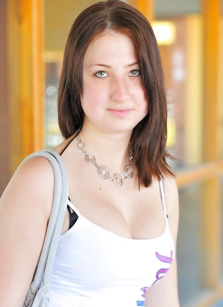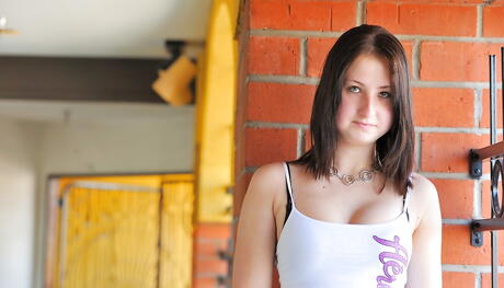 Luscious dark-haired teen Veronika in sexy undies bares tiny tits and plays with dildo