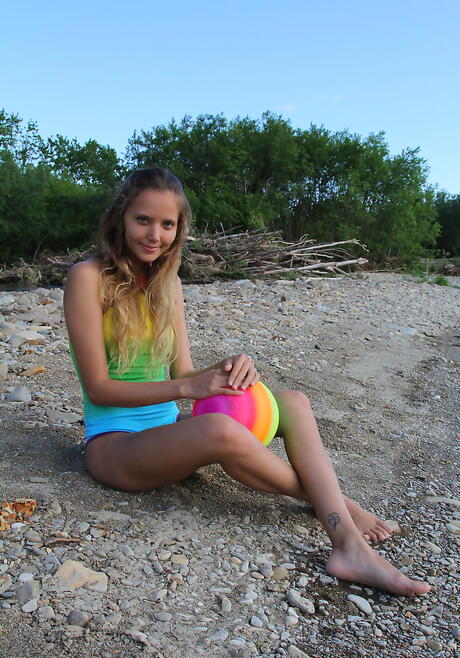 Luscious dark-haired young Katya Clover shows small tits and bald pussy at beach
