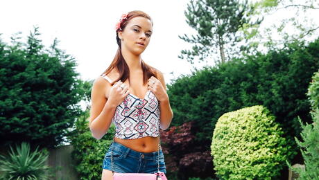 Luscious french young Lea Guerlin in sexy shorts uncovering tiny tits and masturbating at pool