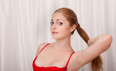 Luscious redheaded young Amorett in hot lingerie shows tiny tits and vagina