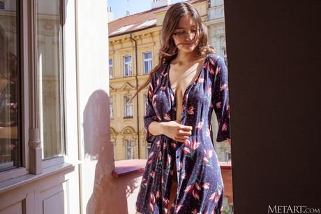 Adeline alluringly strips off her dress and exposes her big tits and hairy pussy