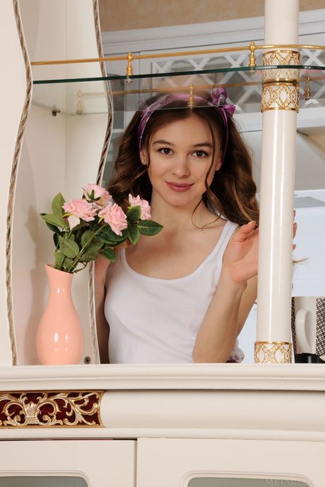 Adorable teen Kaleesy gets naked in the kitchen before eating chocolate