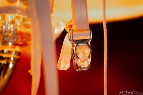 Alluring teen Anthea removes her lingerie and stockings to get bare naked