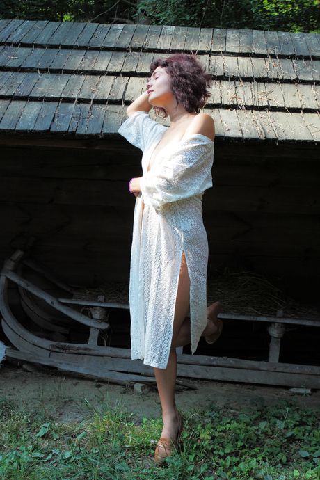 Alluring teen Callista B removes her dress to pose nude in the backyard