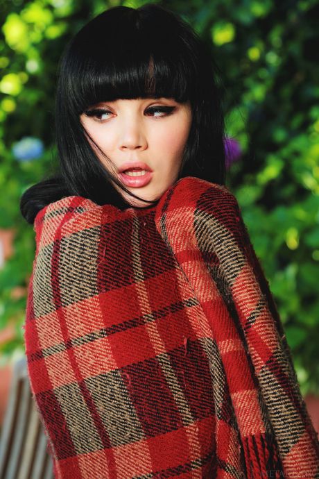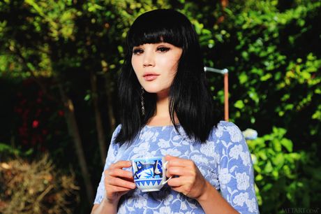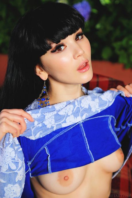 Alluring teen Malena removes her blue dress and stockings to pose nude in the yard