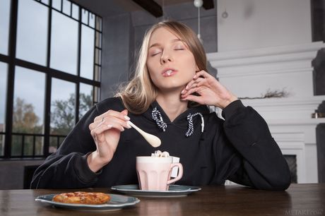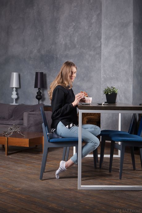 Alluring teen Nimfa removes her jeans and socks to pose nude in her bedroom