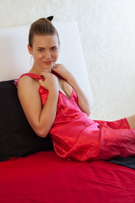 Angelic teen Alaine removes a pink dress to model naked in the kitchen