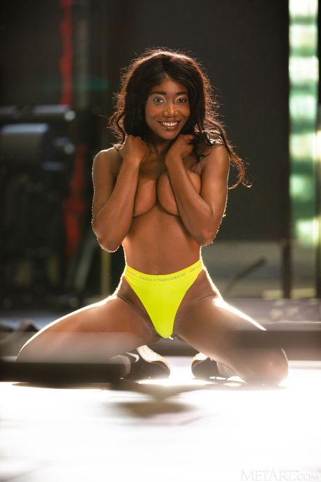 Athletic black teen Mimi Desuka gets naked during a workout