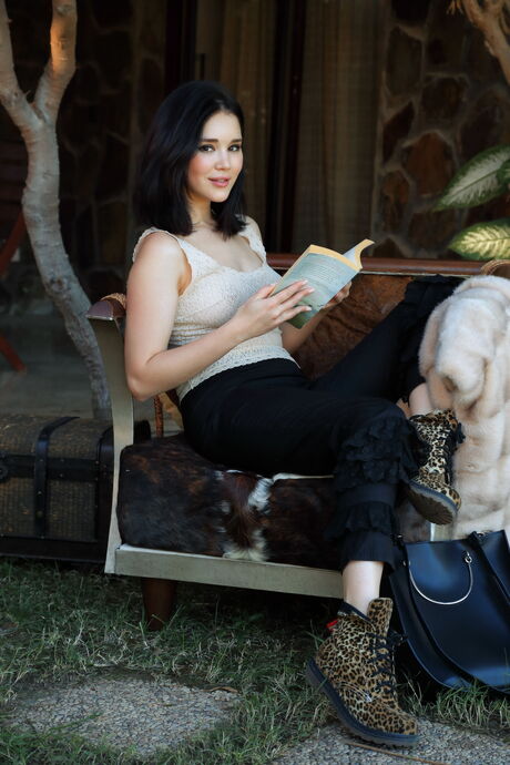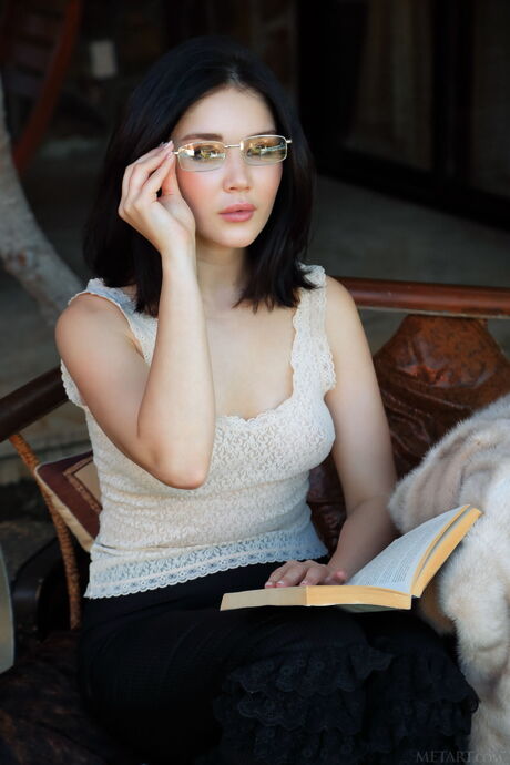 Attractive teen Malena goes nude in a garden chair while wearing sunglasses
