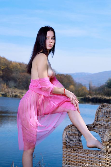 Attractive teen Polly Pure strips naked & poses nude by a lake in a solo