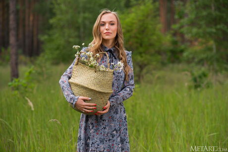 Bashful teen Aislin bares it all on a blanket in a field of wildflowers