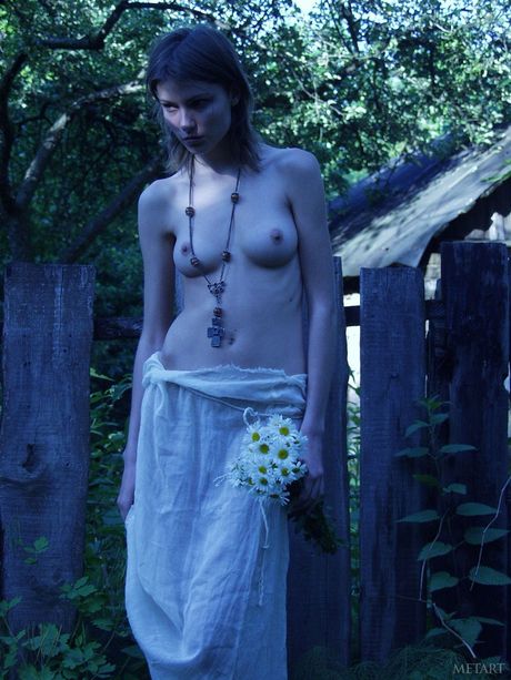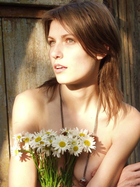 Bashful teen Models No Name poses naked in a field of wildflowers