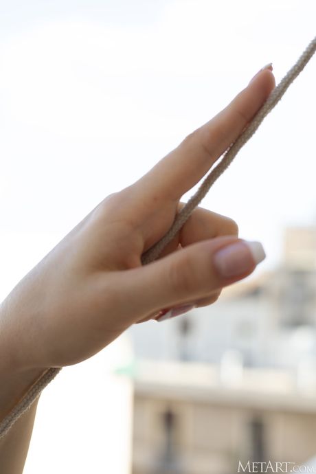 Bashful teen Tara D gets naked on a balcony before showing her bald pussy