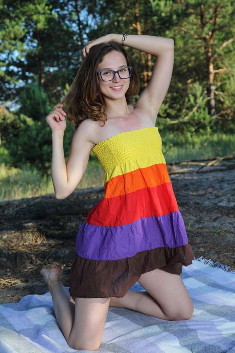 Beautiful teen Ava removes her glasses and clothes to pose nude on a blanket