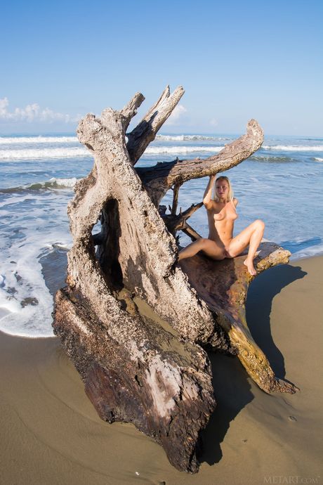 Blonde amateur Naomi Keen displays her big tits and poses naked on the beach