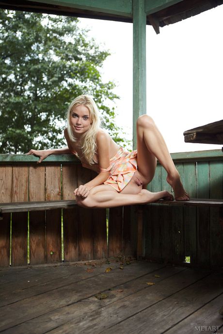 Blonde Russian lady Aljena A strips naked outdoors and shows her tiny tits