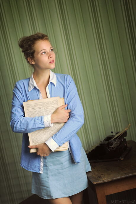 Blonde secretary Helena gets naked on her desk and presents her tiny tits