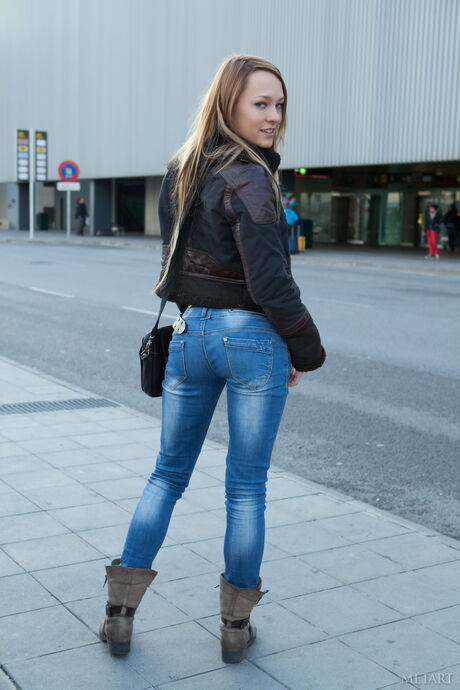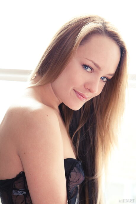 Blonde teen Blue Angel removes her lingerie and boots to get naked