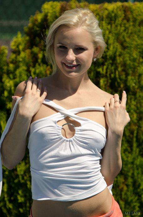 Blonde teen Claudie A strips down while in a backyard pool